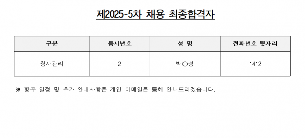 - 다음글정규직(한울 청사관리) 채용 면접전형 결과안내 25.07.09